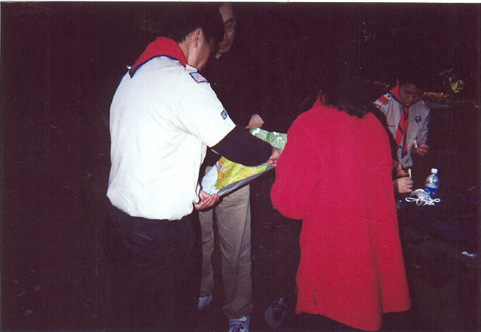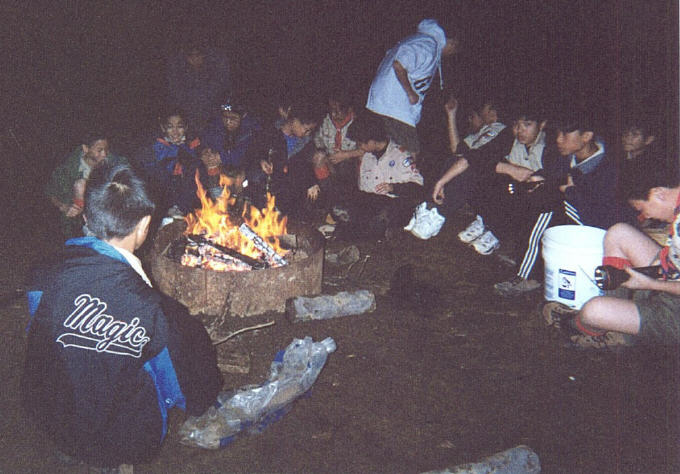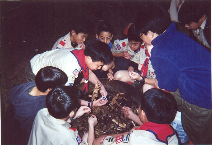 Scout leader, Eric Chung, lit the campfire. Younger scouts holding their breath. Are they interested in learning?