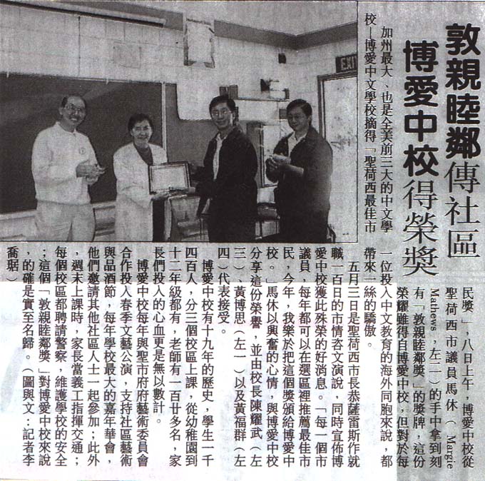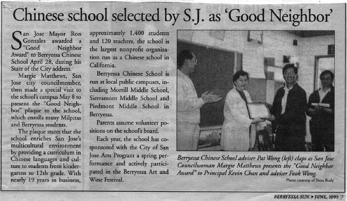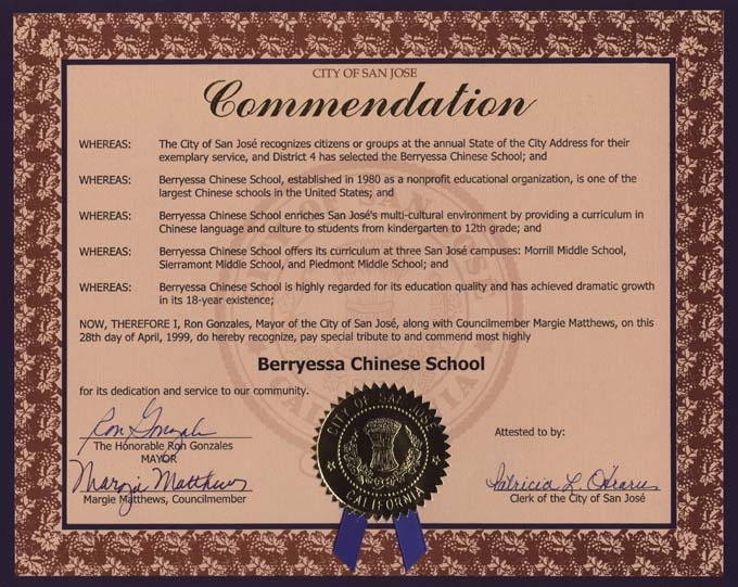 Berryessa Chinese School was honored for the dedication in preserving Chinese languages and cultures. The School was praised for "serving a critical role in promoting cultural awareness, enhancing overall education of our young people, and making the City of San Jose and the entire Silicon Valley region a place where we celebrate the contributions of our diverse population." The award was nominated by Margie Matthews, San Jose District 4 City Councilmember