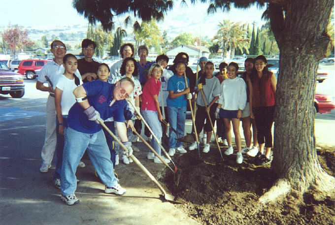 | Berryessa Chinese School parents Tsuey-Yun Wei, Yet-Ping Pai, Yuk-Chan Ko, Lee-Man Chan, Mi-Mi Jin, Pat Wong and others participated in the San Jose Beautiful project. Over 300 daffodil bulbs were planted on three Berryessa middle school campuses during a two week period to beautify the community. |
