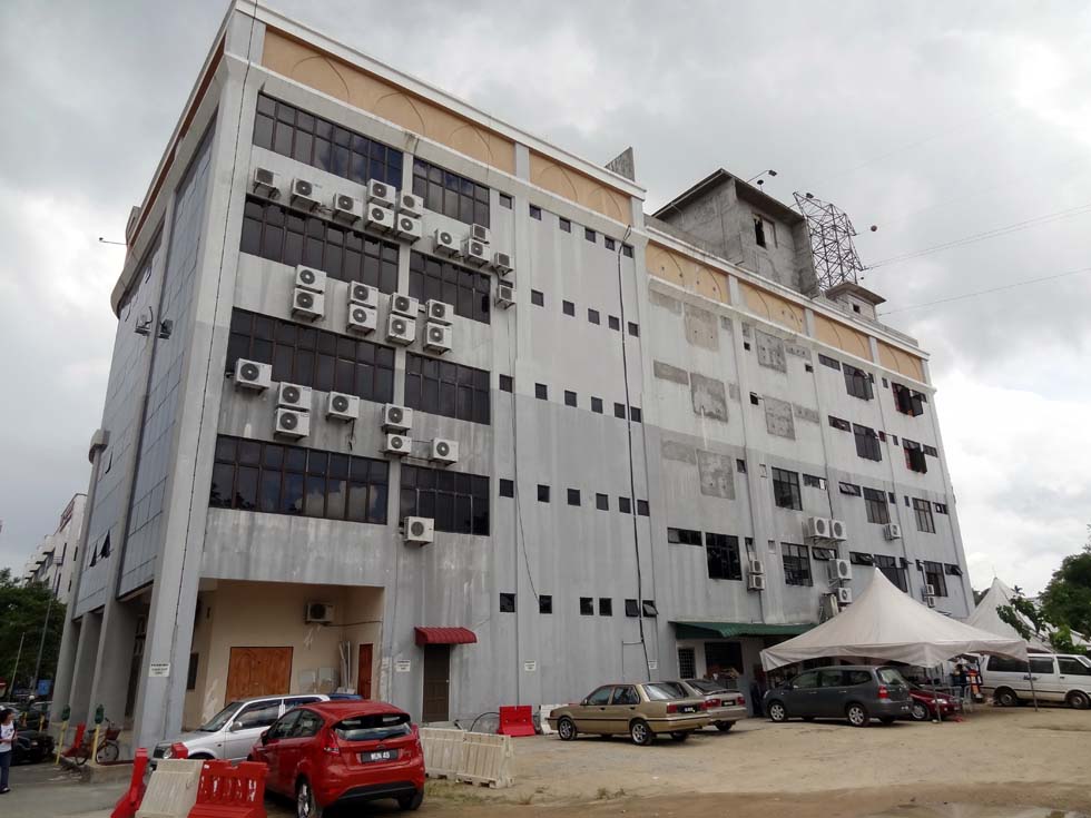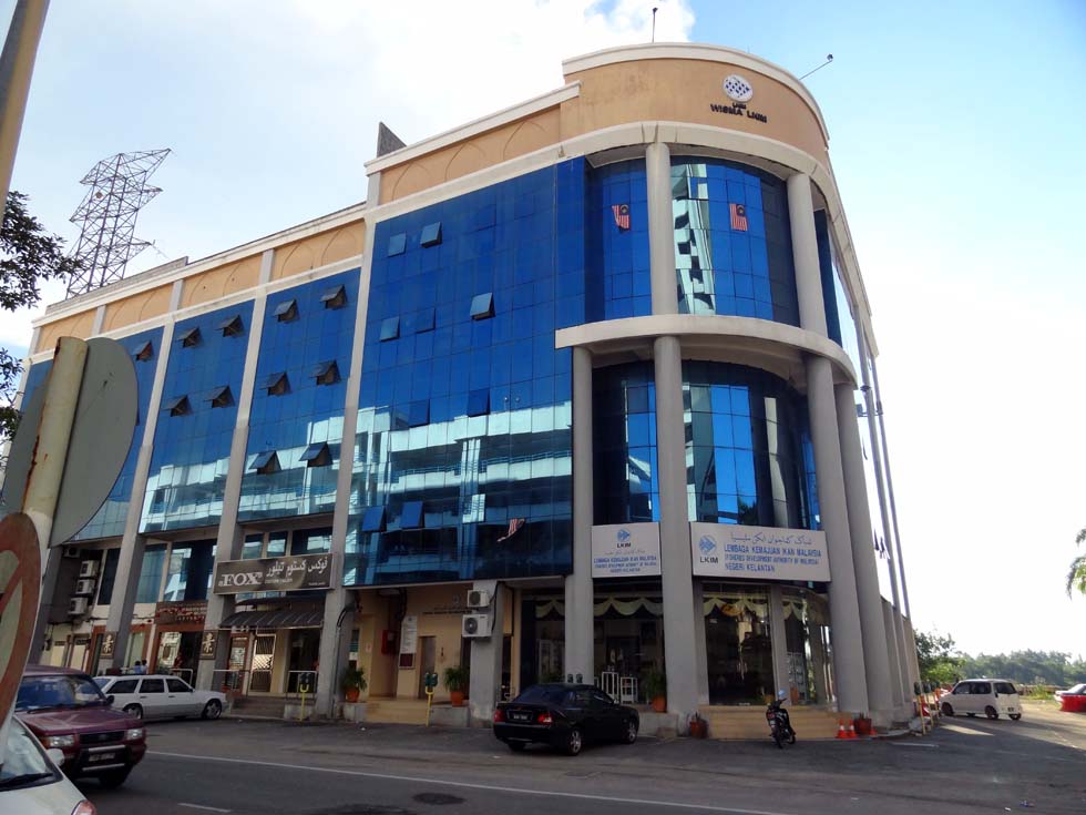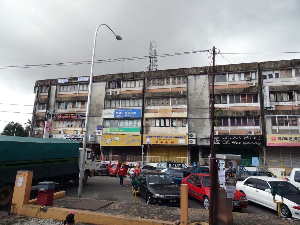 This is the front of a commercial building in downtown Kota Bharu in northeastern Malaysia, across a river from Thailand.   The building housed a few businesses including a restaurant, a school and a showroom for a government-like office. |
