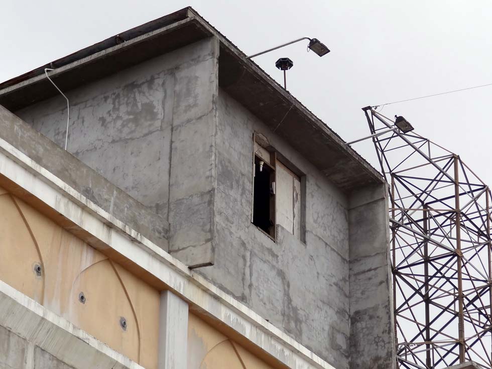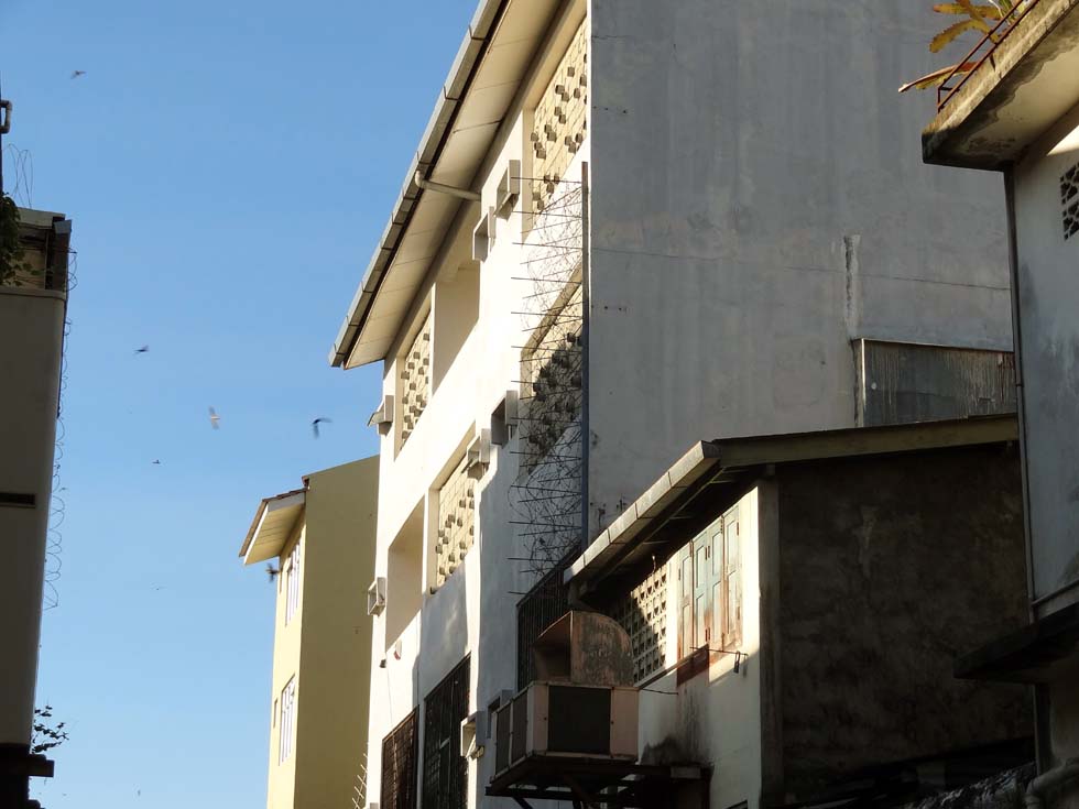 Bird houses can be seen in the middle of this building where the windows are blocked, leaving a number of 'pigeon holes' for the swiftlets access.   Note the clothesline below? |