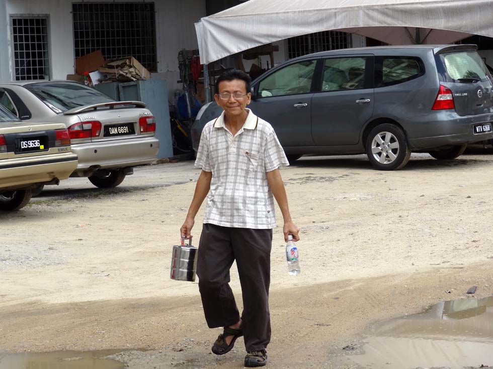 This gentleman had no information to offer about the existence of a bird house in the building.   The design, logistic and operations of bird houses is a trade secret.   Note the gentleman was carrying a lunch box from the 1950s era which was still widely used in Malaysia. |