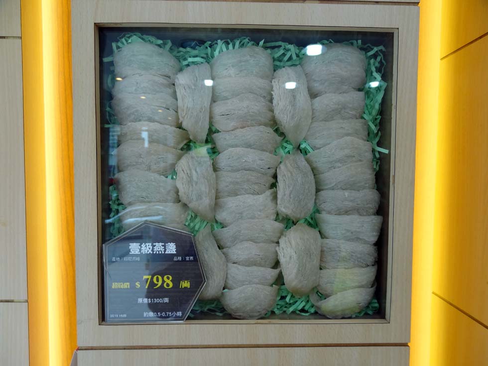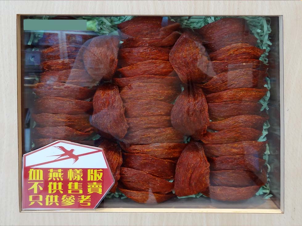 This is a box of bird nest sold for about US$60/oz.   The nutritional value of 100 g of dry nest includes 49.9 g of water-soluble protein (including amido nitrogen, monoamine nitrogen, non-amino nitrogen, arginiforne, humin, histidine, lysine and cysteine), 30.6 g carbohydrate (glycoprotein and mucin), 4.9 g iron, 2.5 g inorganic salt (including potassium, sodium, calcium, magnesium, sulfur, phosphorus, silica and other trace elements), and 1.4 g fiber (Dictionary of Traditional Chinese Medicine, The History of Chinese Medicine and the Nutrition Table). |